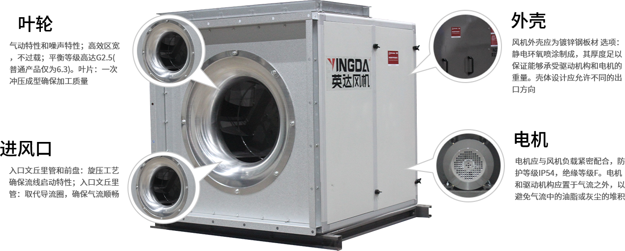 風(fēng)機外殼應(yīng)為鍍鋅鋼板材[選項:靜電環(huán)氧噴涂]制成,其厚度足以保證能夠承受驅(qū)動機構(gòu)和電機的重量。殼體設(shè)計應(yīng)允許不同的出口方向。