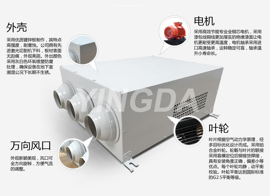 英達風機采用優(yōu)質(zhì)鍍鋅板制作,其特點高強度,耐腐蝕。公司擁有先進激光切割機下料,板材表面無刮痕,外觀亮麗。外出顏色采用灰白色環(huán)氧噴塑防腐處理,確保設(shè)備在地下室潮濕公況下長期不生銹。