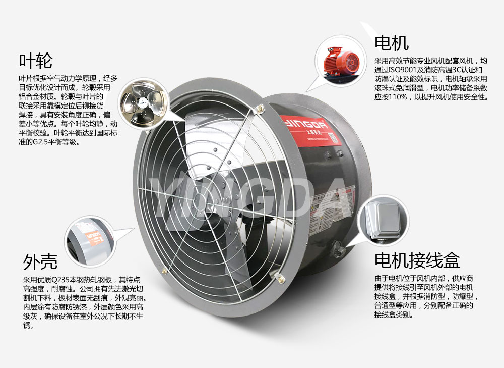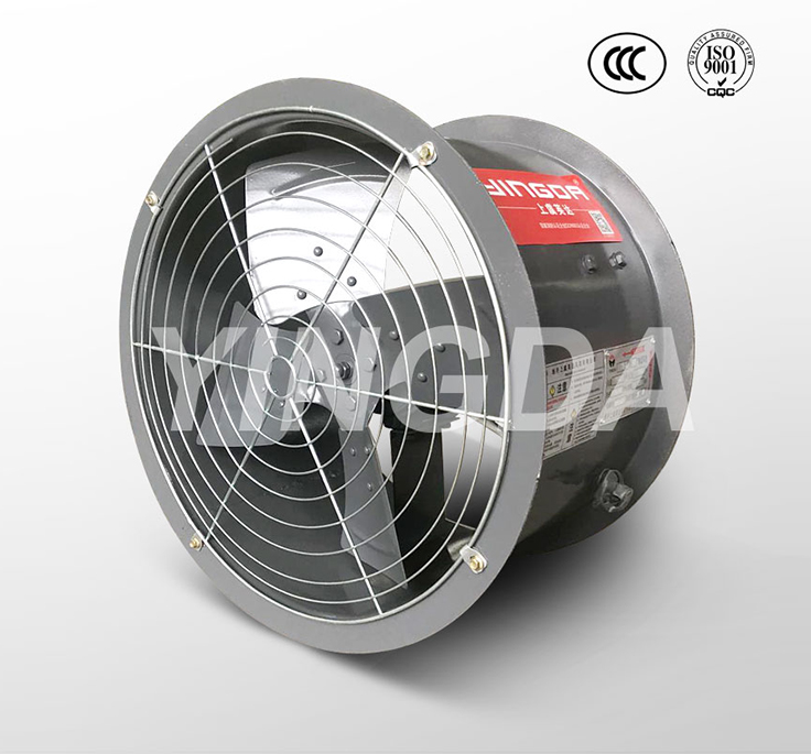 1.2.按直徑分為250~1100mm共14種規(guī)格,每一規(guī)格風(fēng)機葉片數(shù)都為4片,參數(shù)范圍廣,風(fēng)量800~65000 m3/h,風(fēng)壓40~470Pa。風(fēng)機可壁式安裝也可管道式安裝。